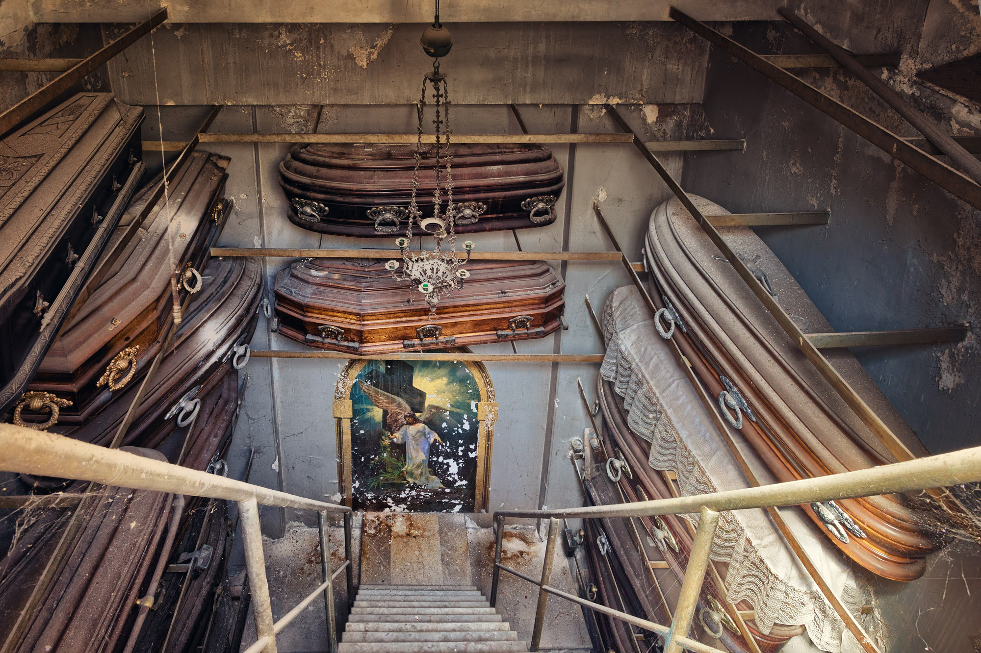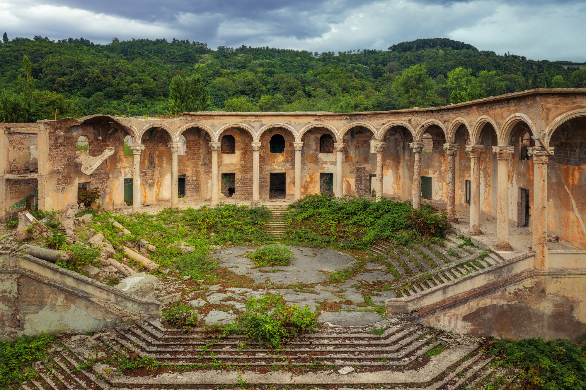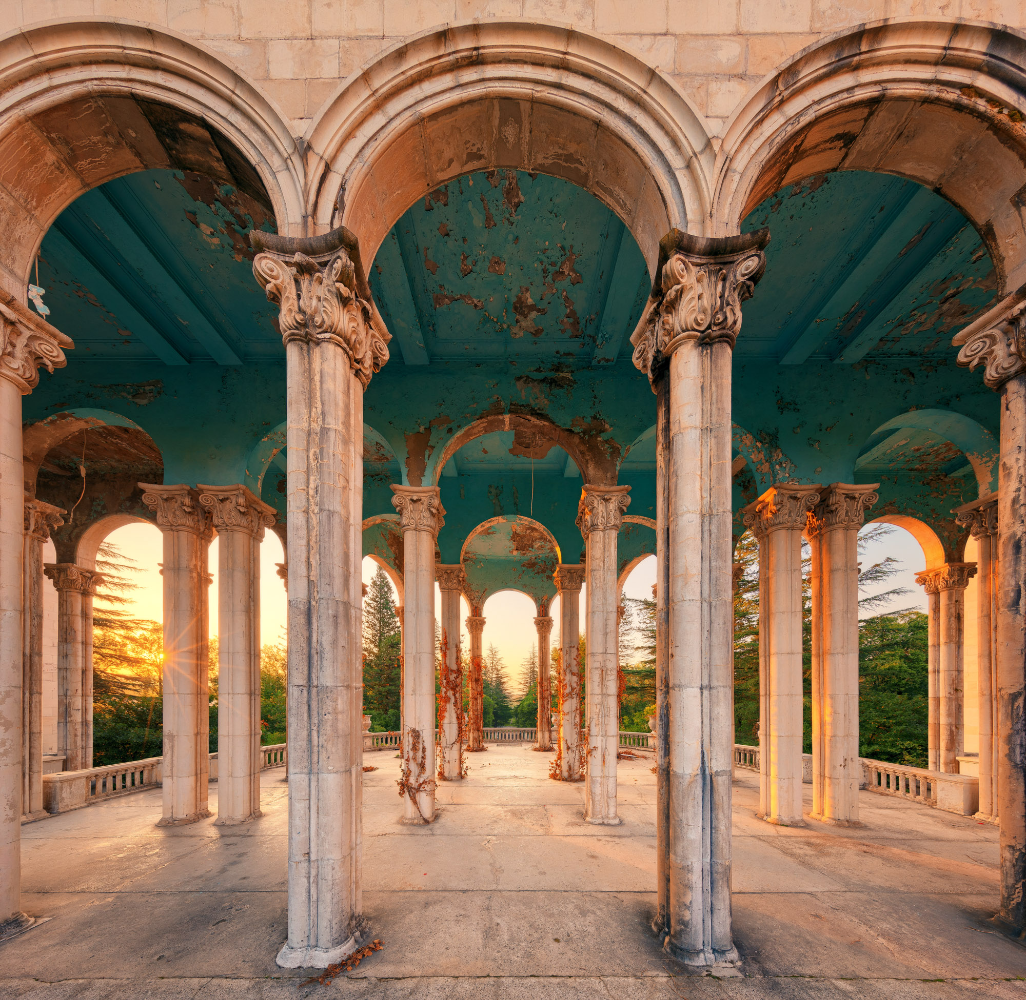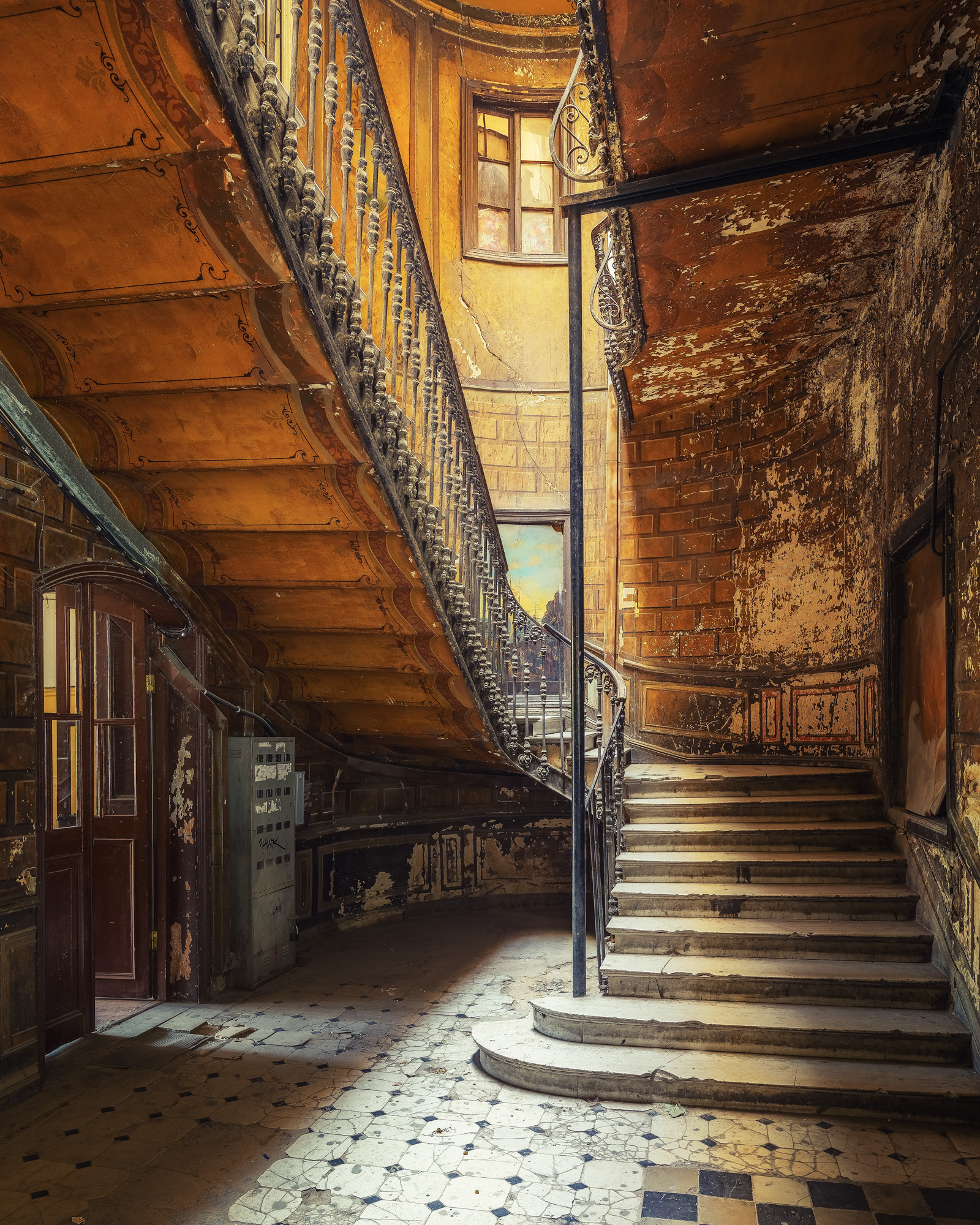 ..a forgotten staircase in an Abkhazian sanatorium, revealing layers of time.