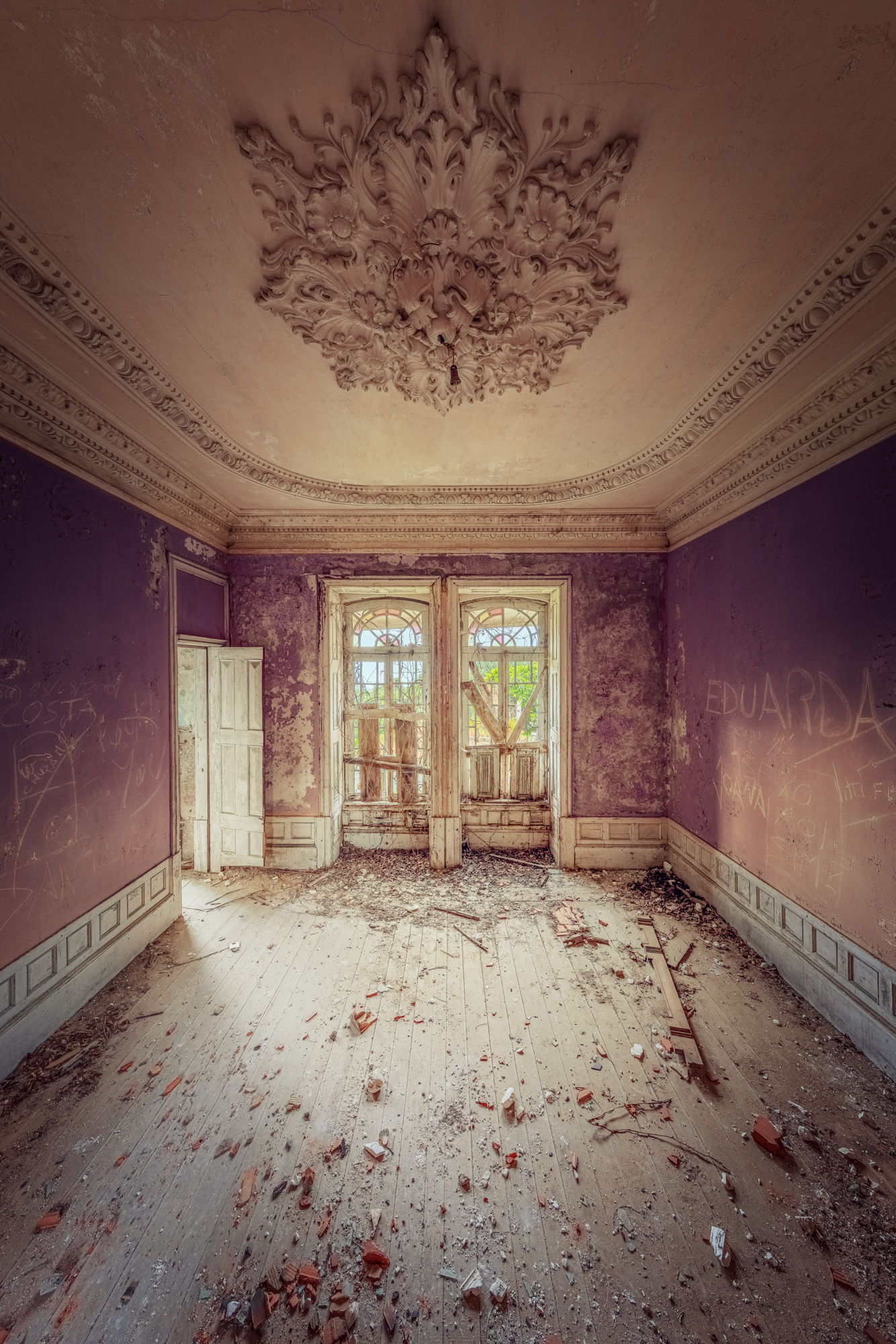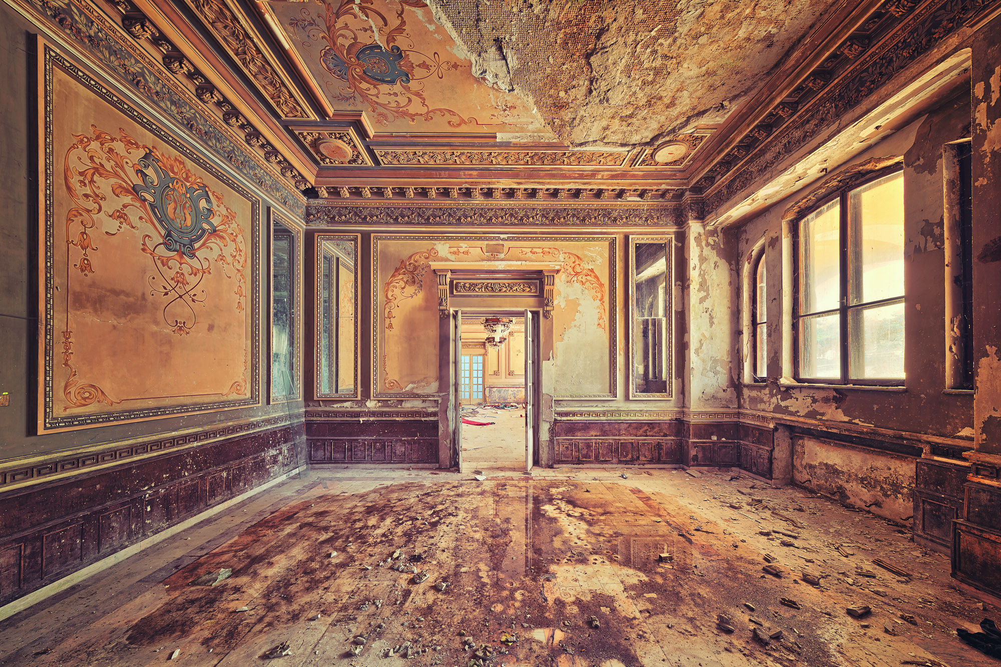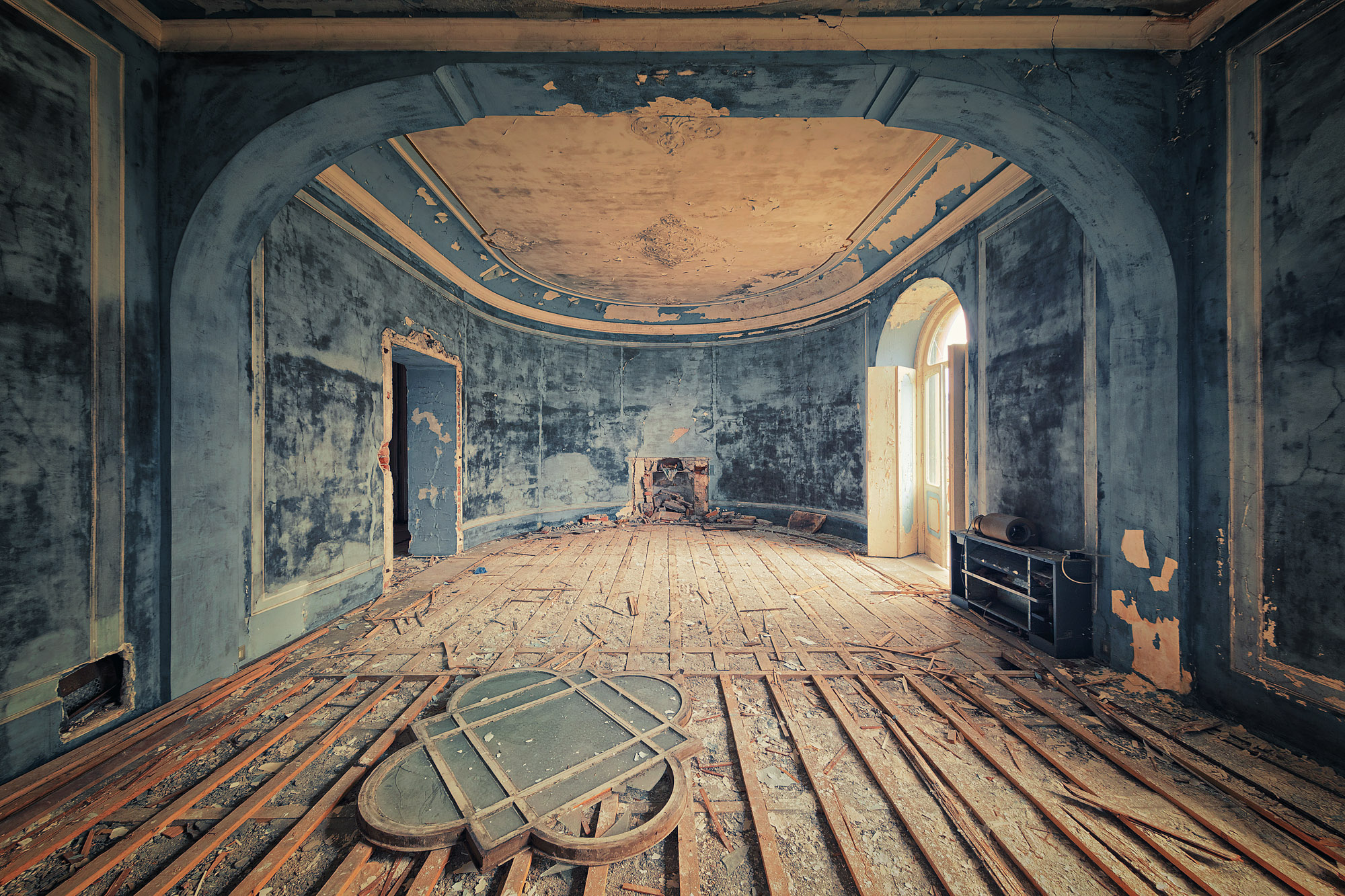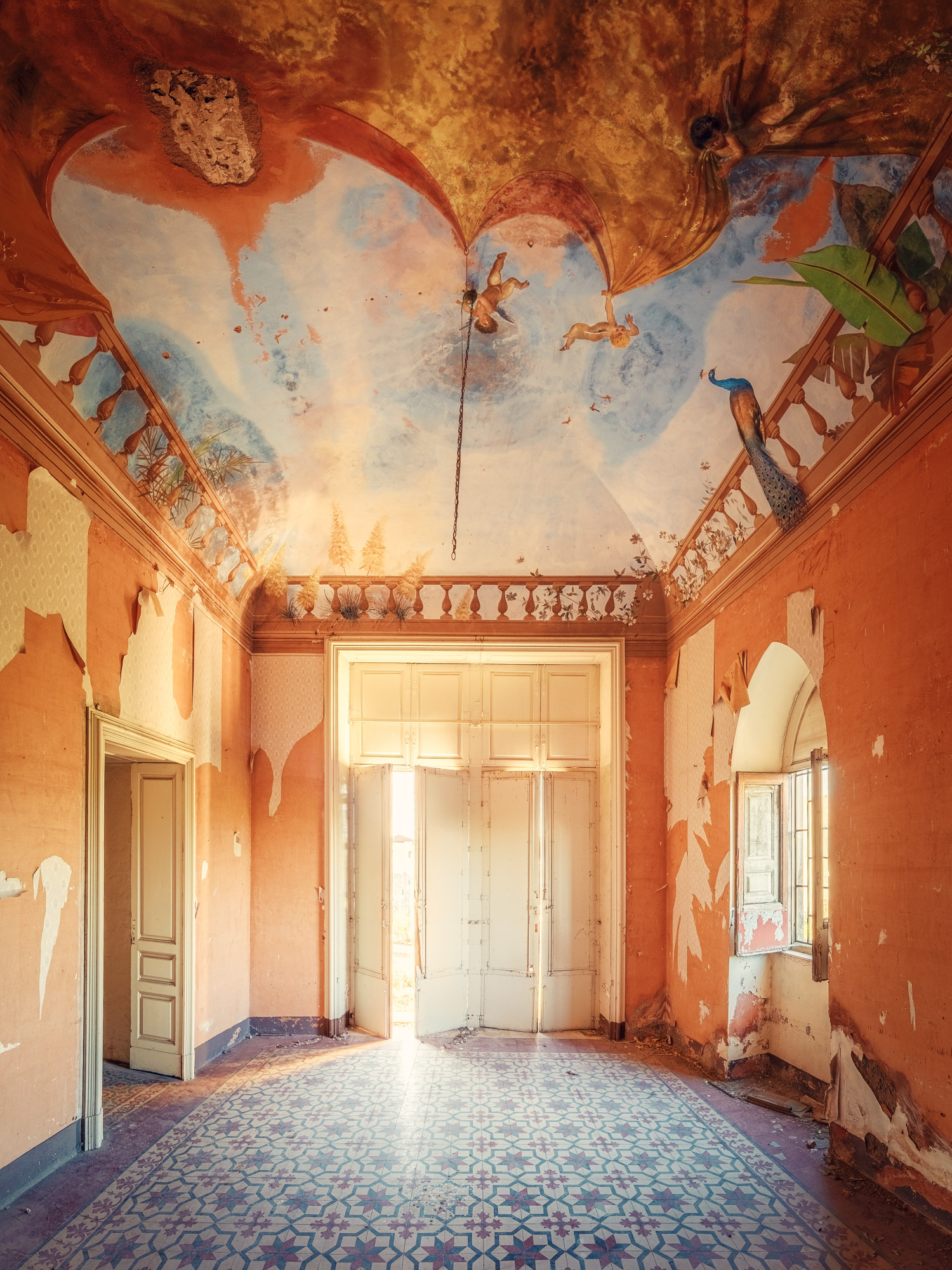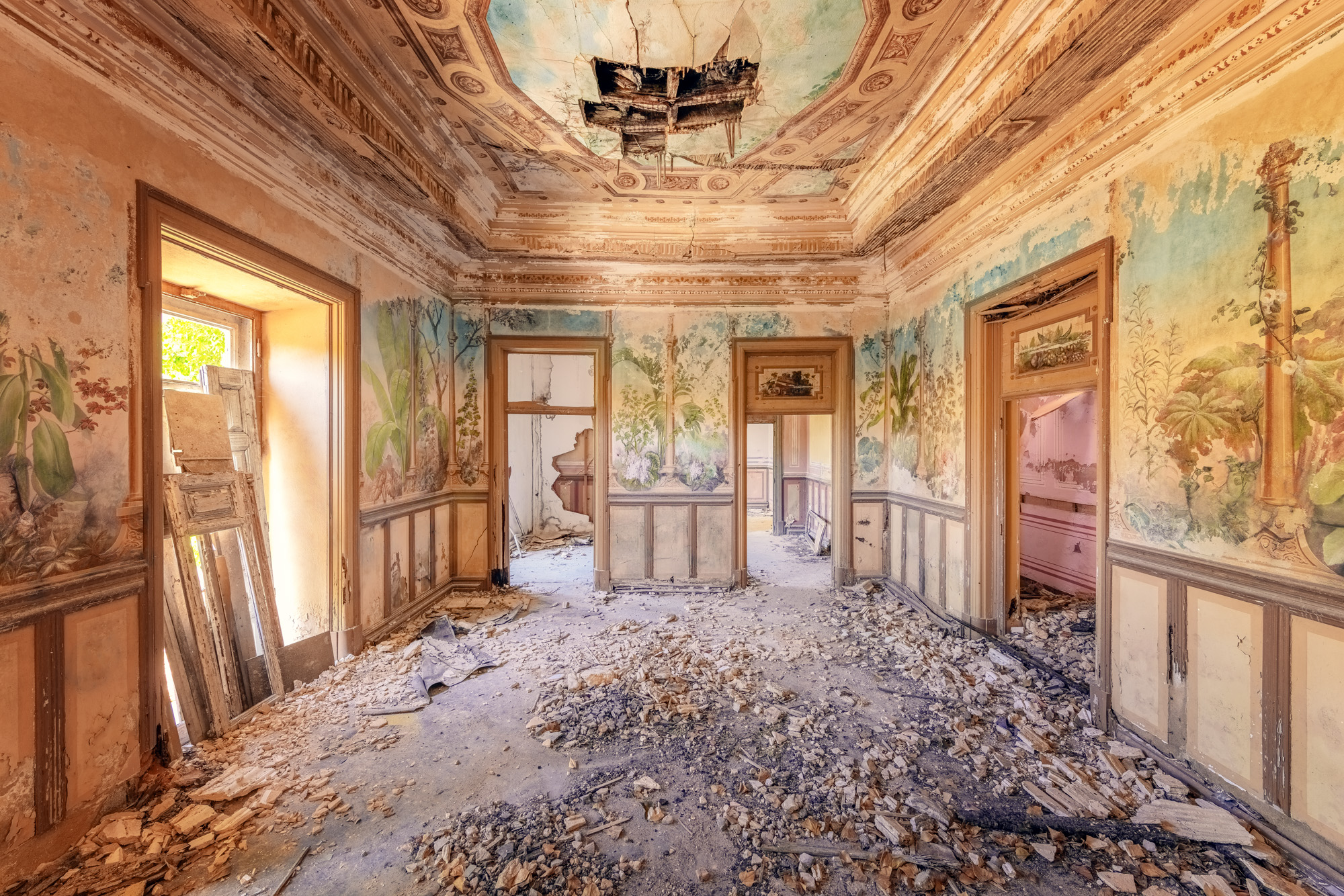 Peeling walls and shadows dominate the deserted estate, leaving only the faint impression of past beauty.