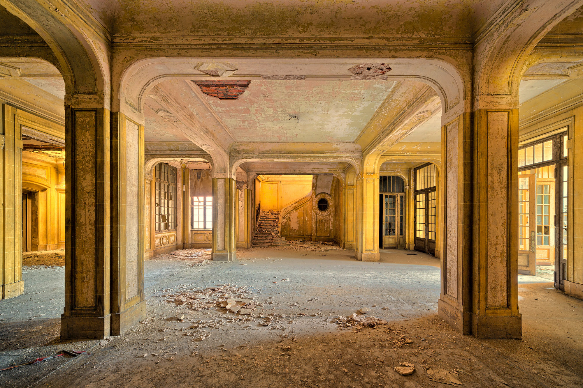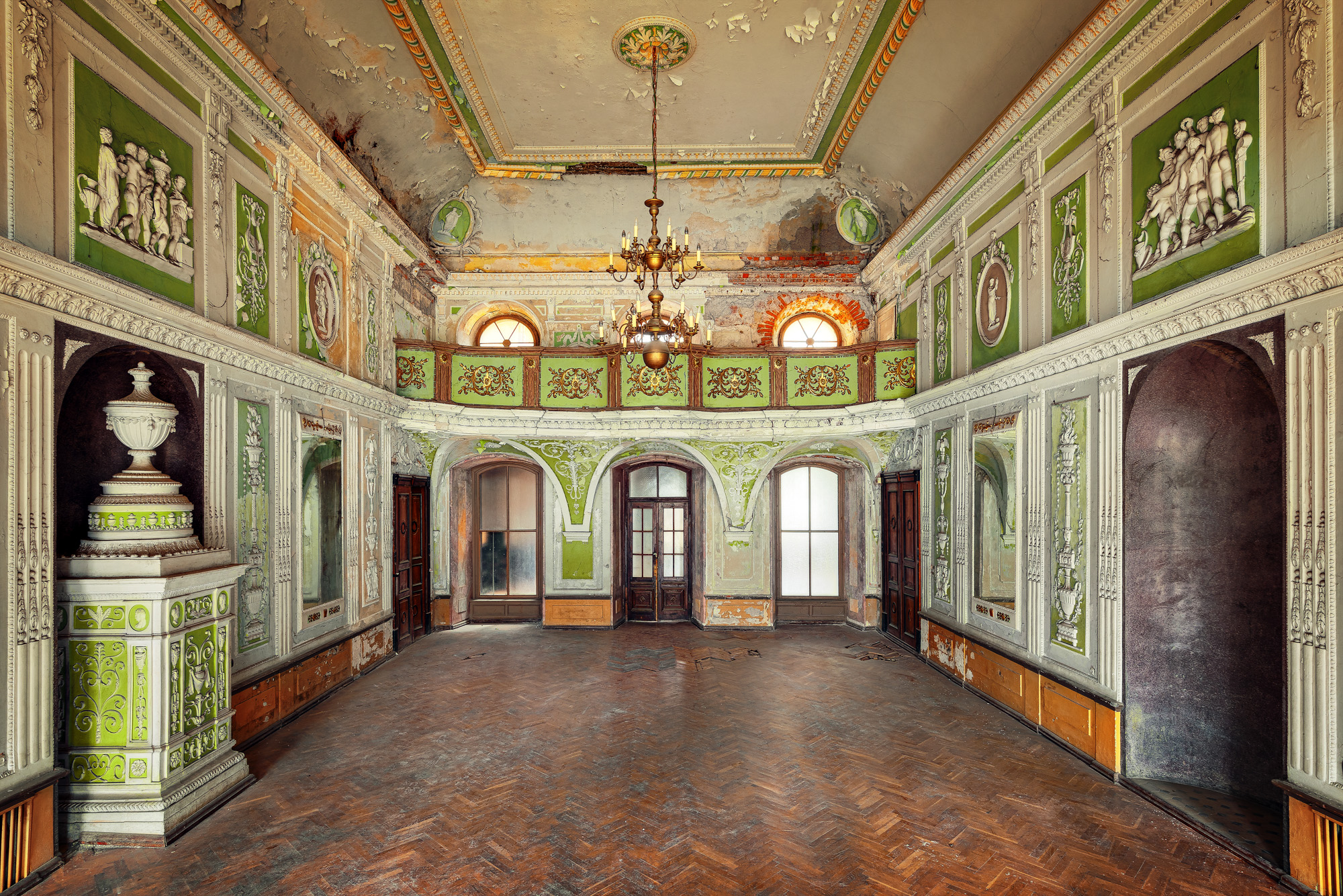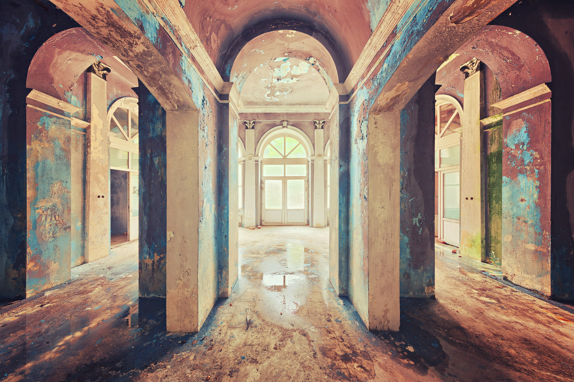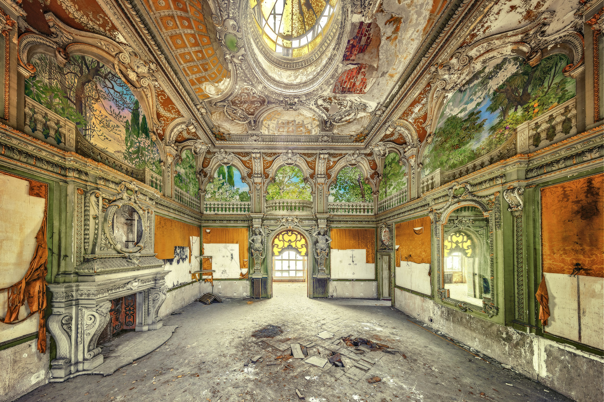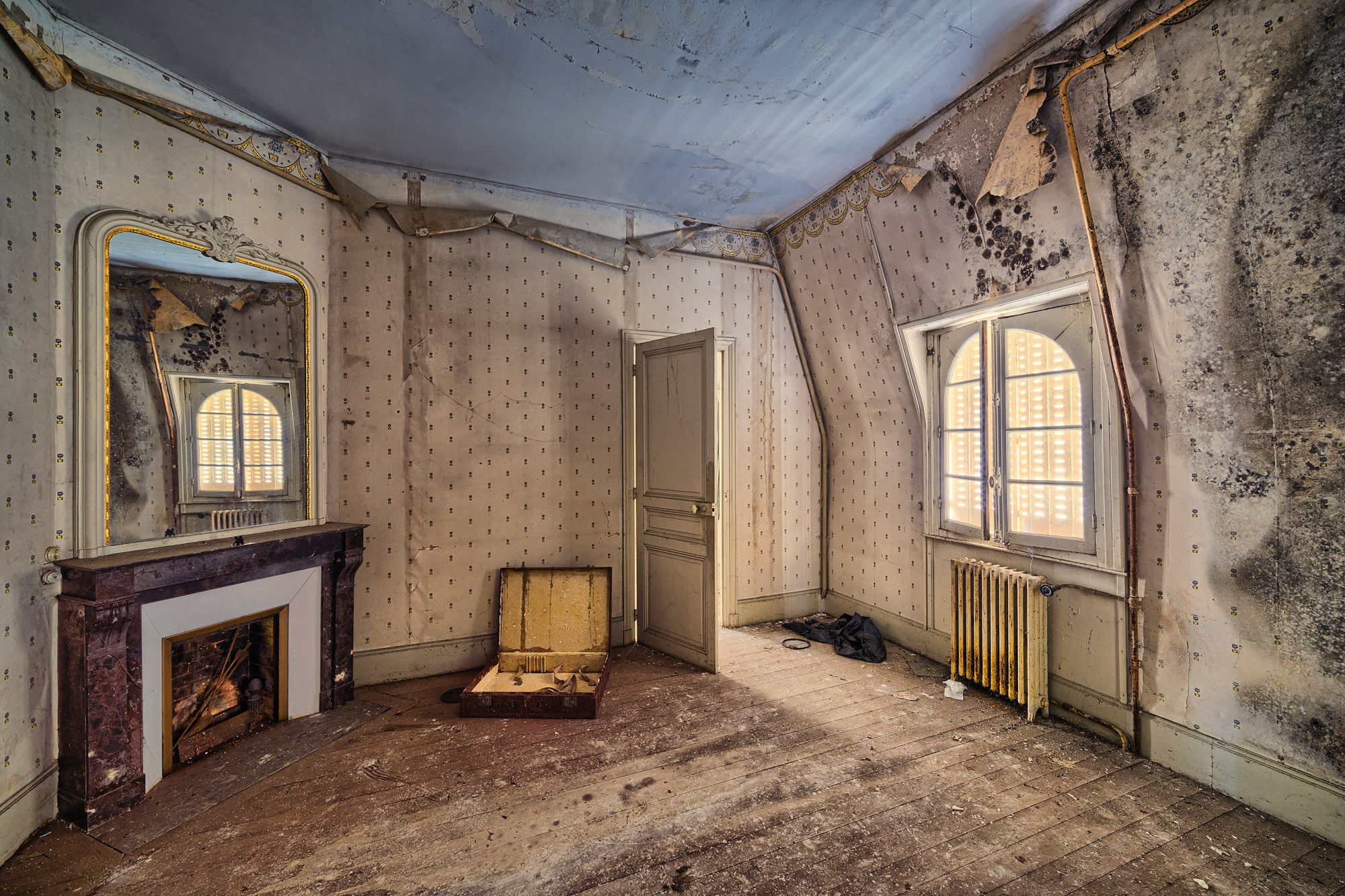 Peeling walls and shadows dominate the deserted estate, leaving only the faint impression of past beauty.