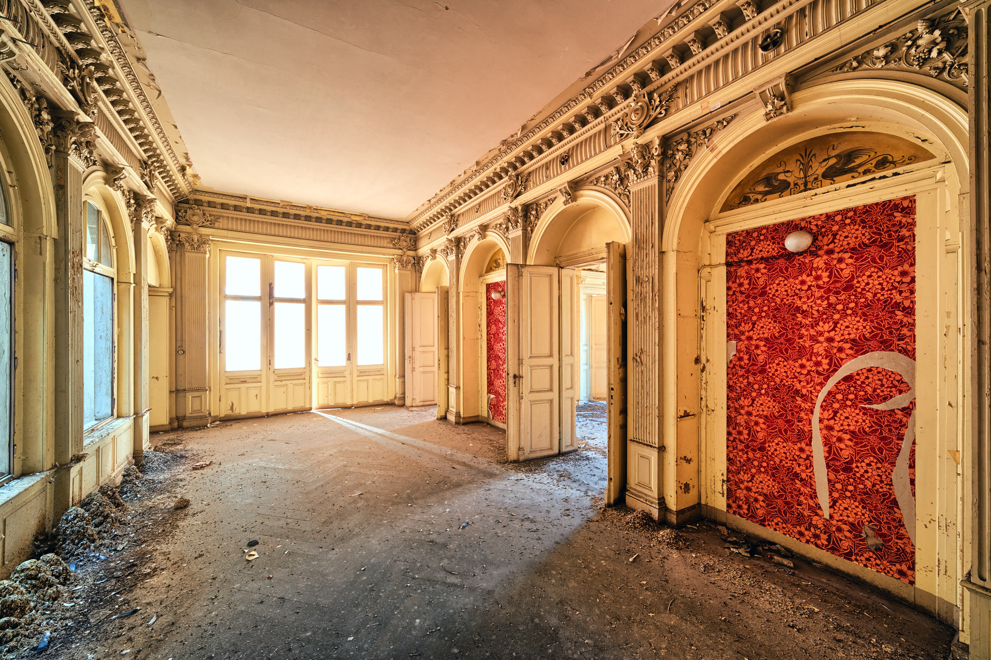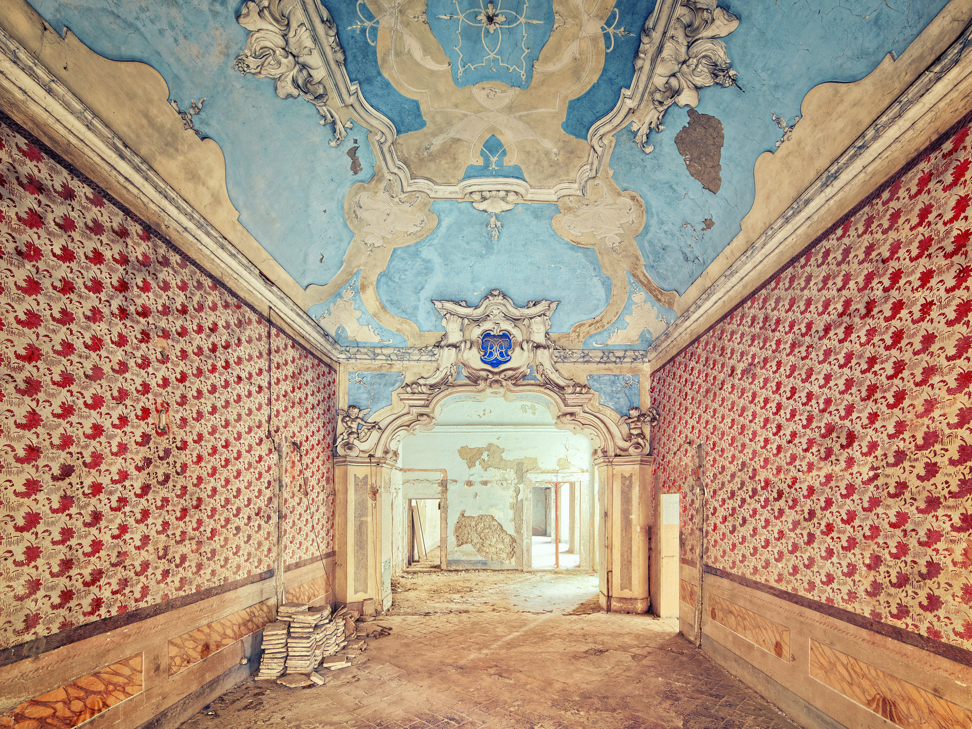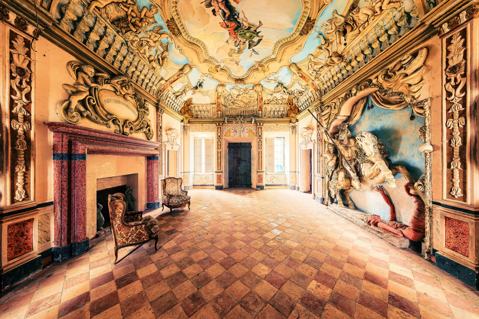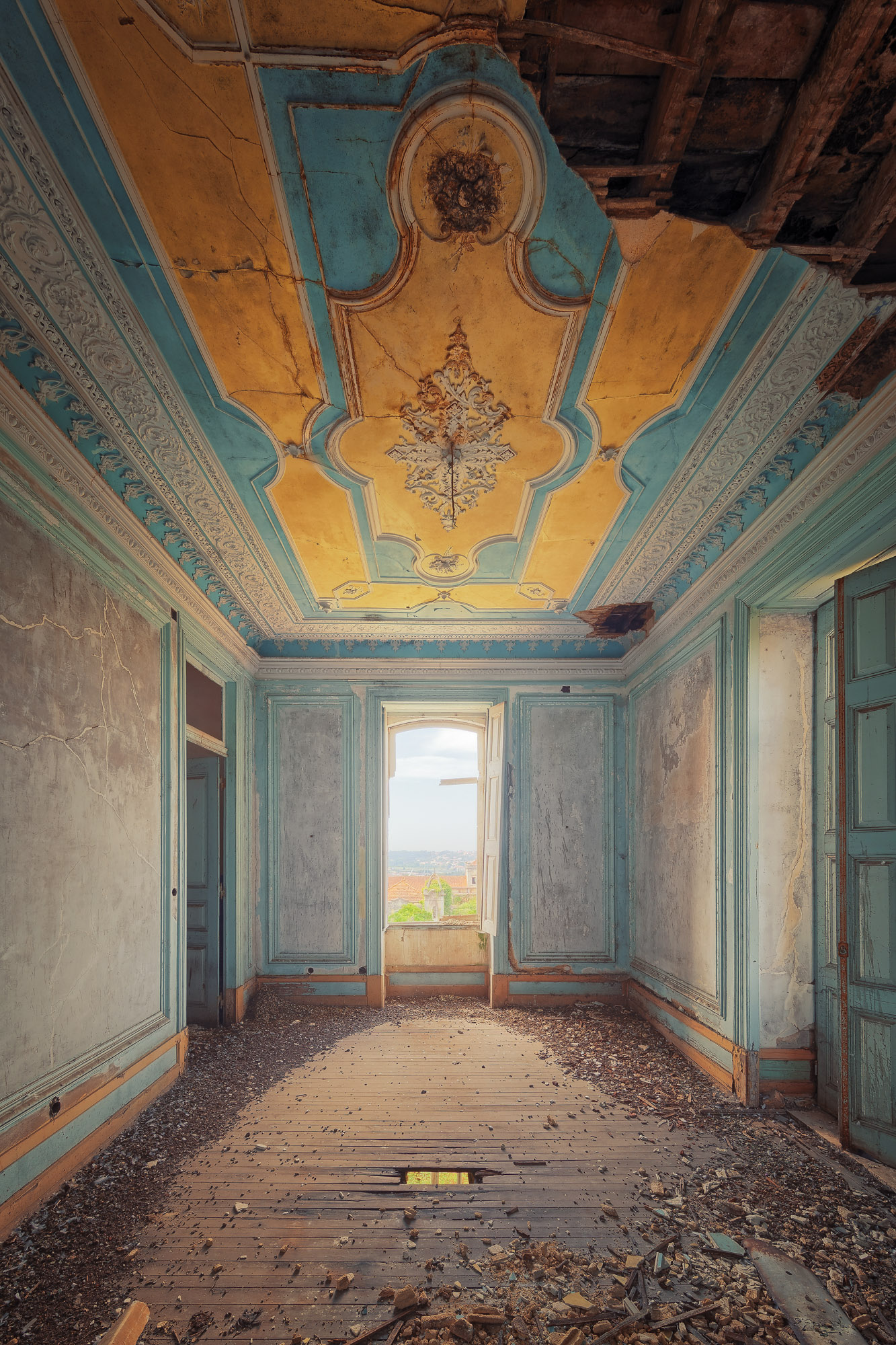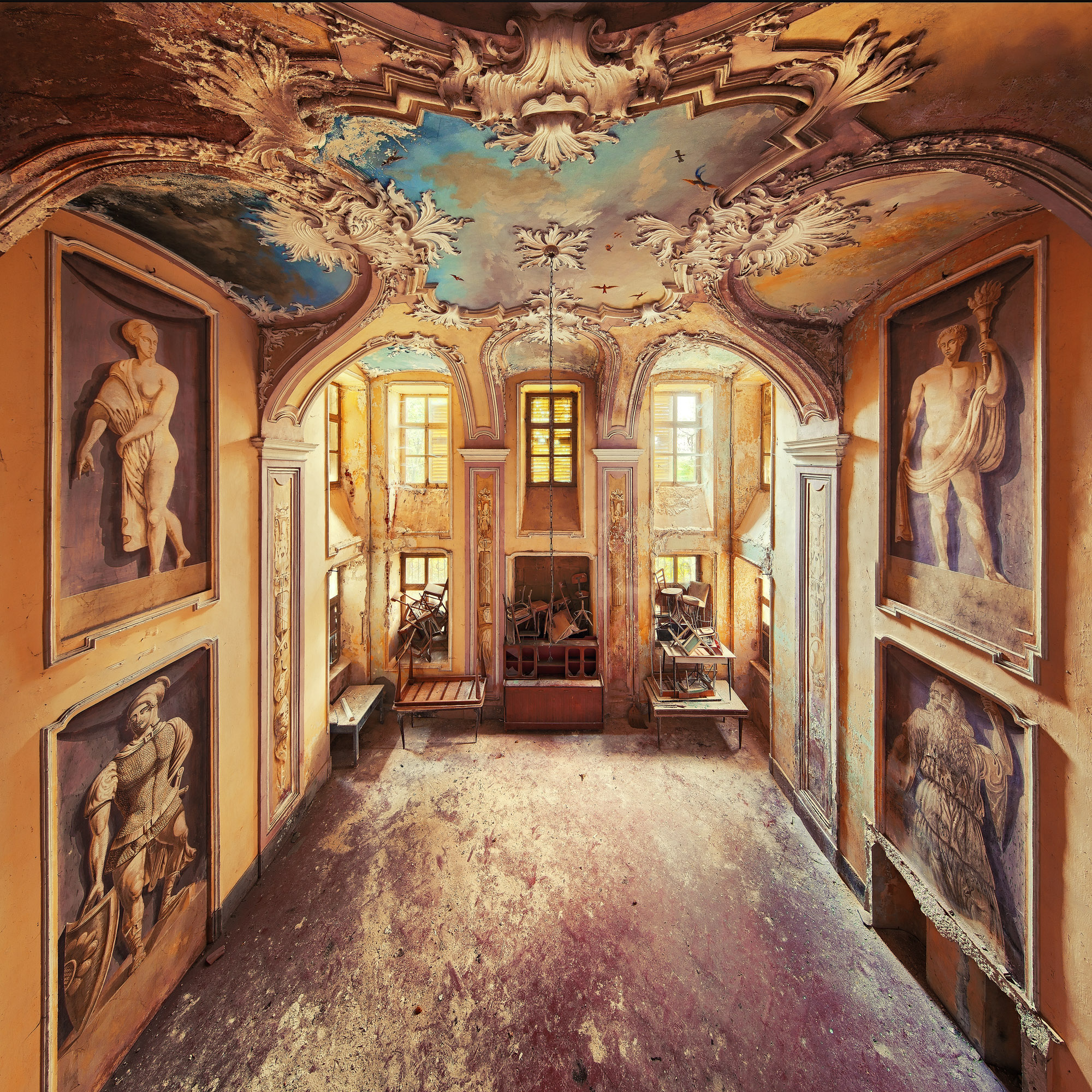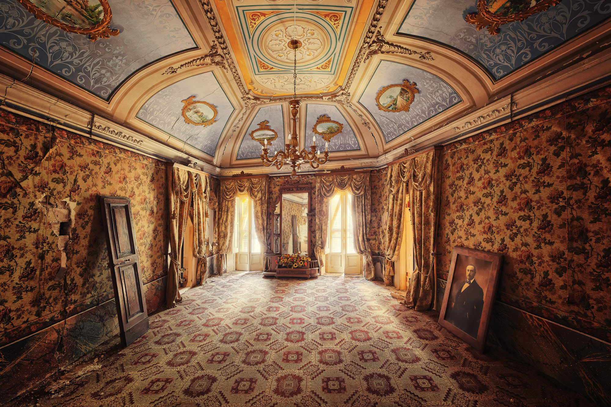 Peeling walls and shadows dominate the deserted estate, leaving only the faint impression of past beauty.