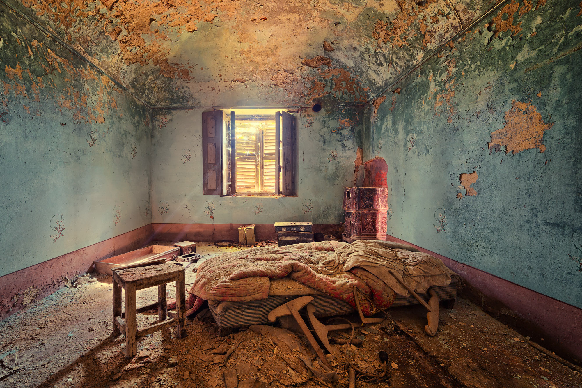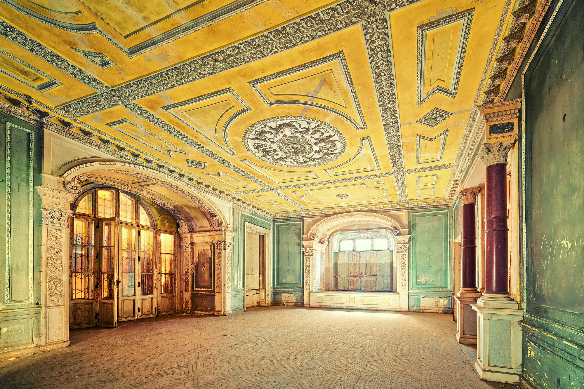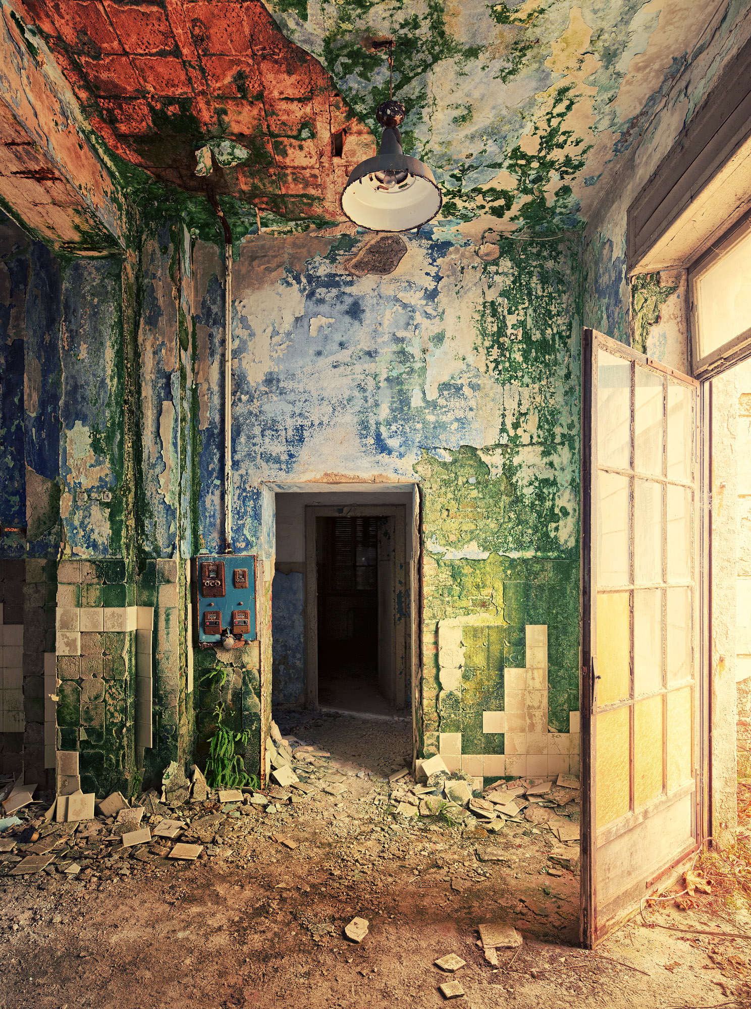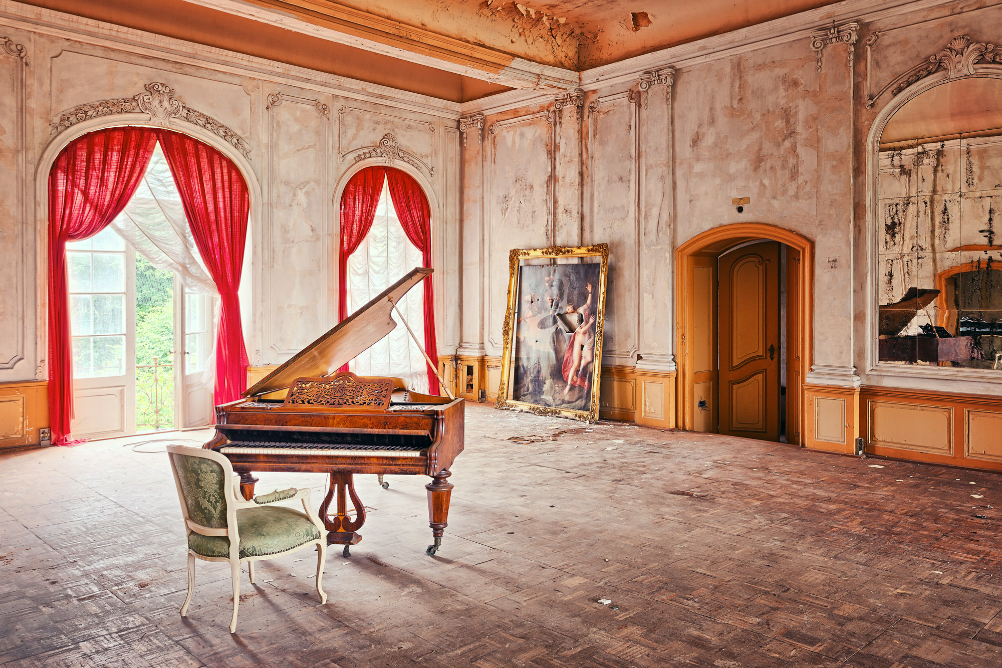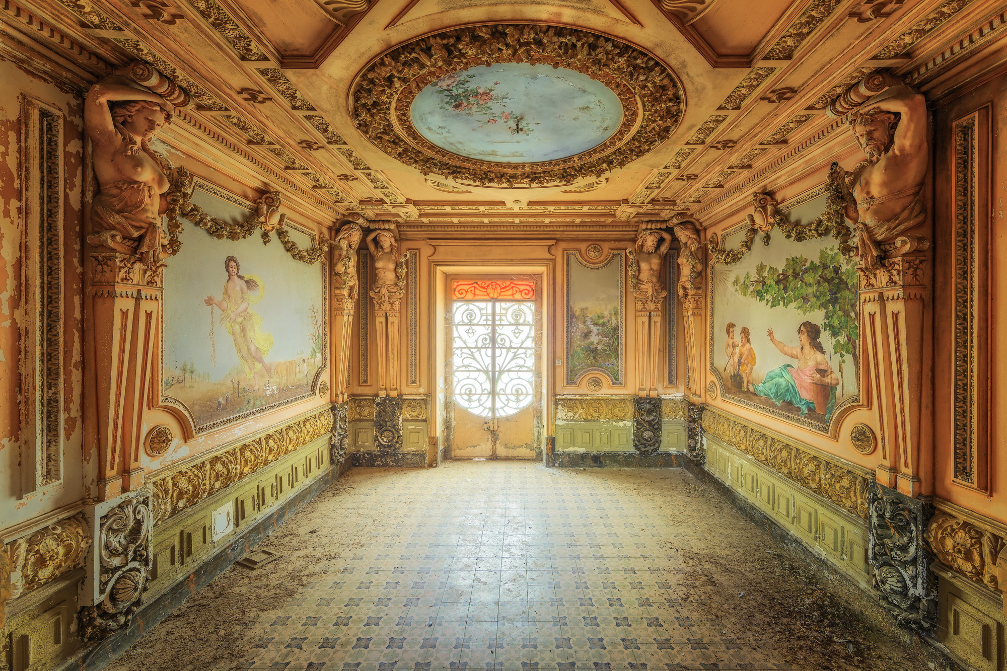 Peeling walls and shadows dominate the deserted estate, leaving only the faint impression of past beauty.