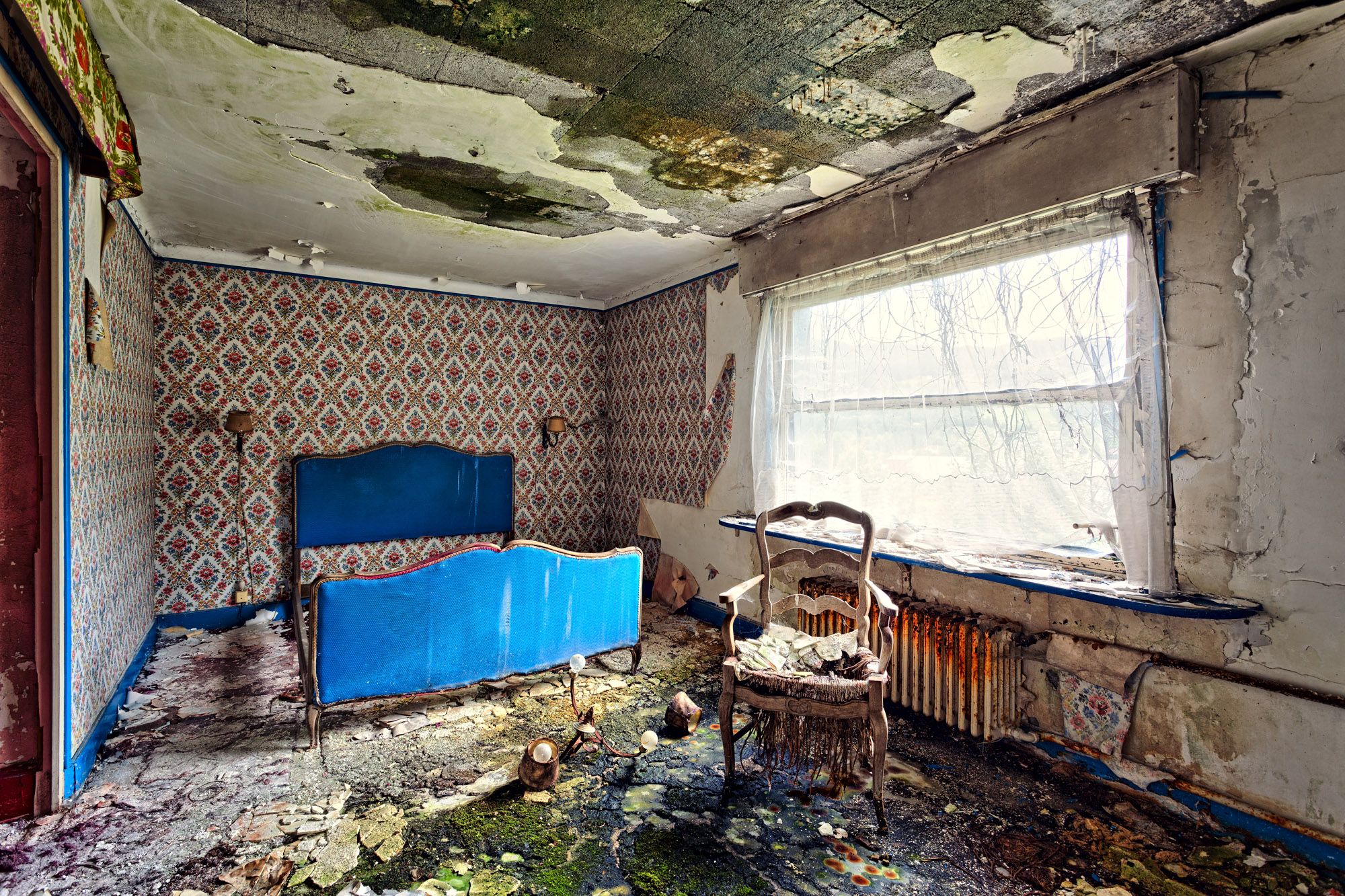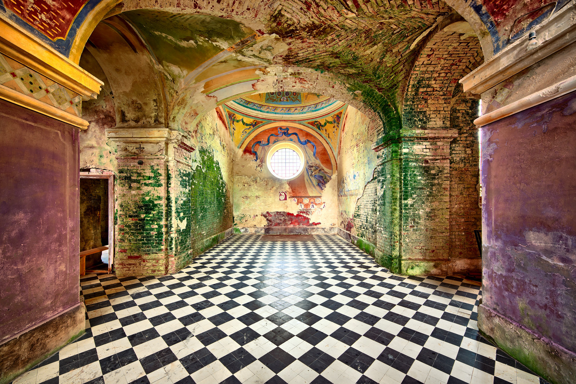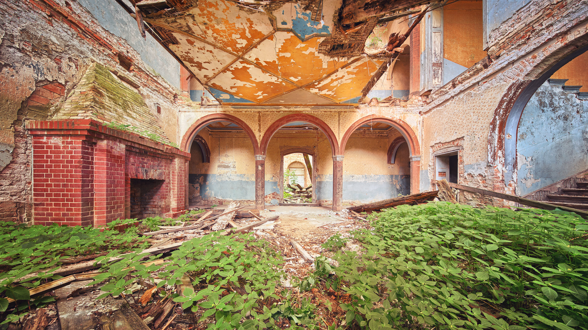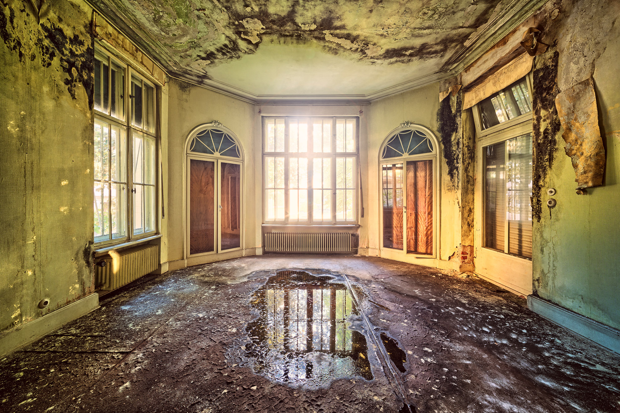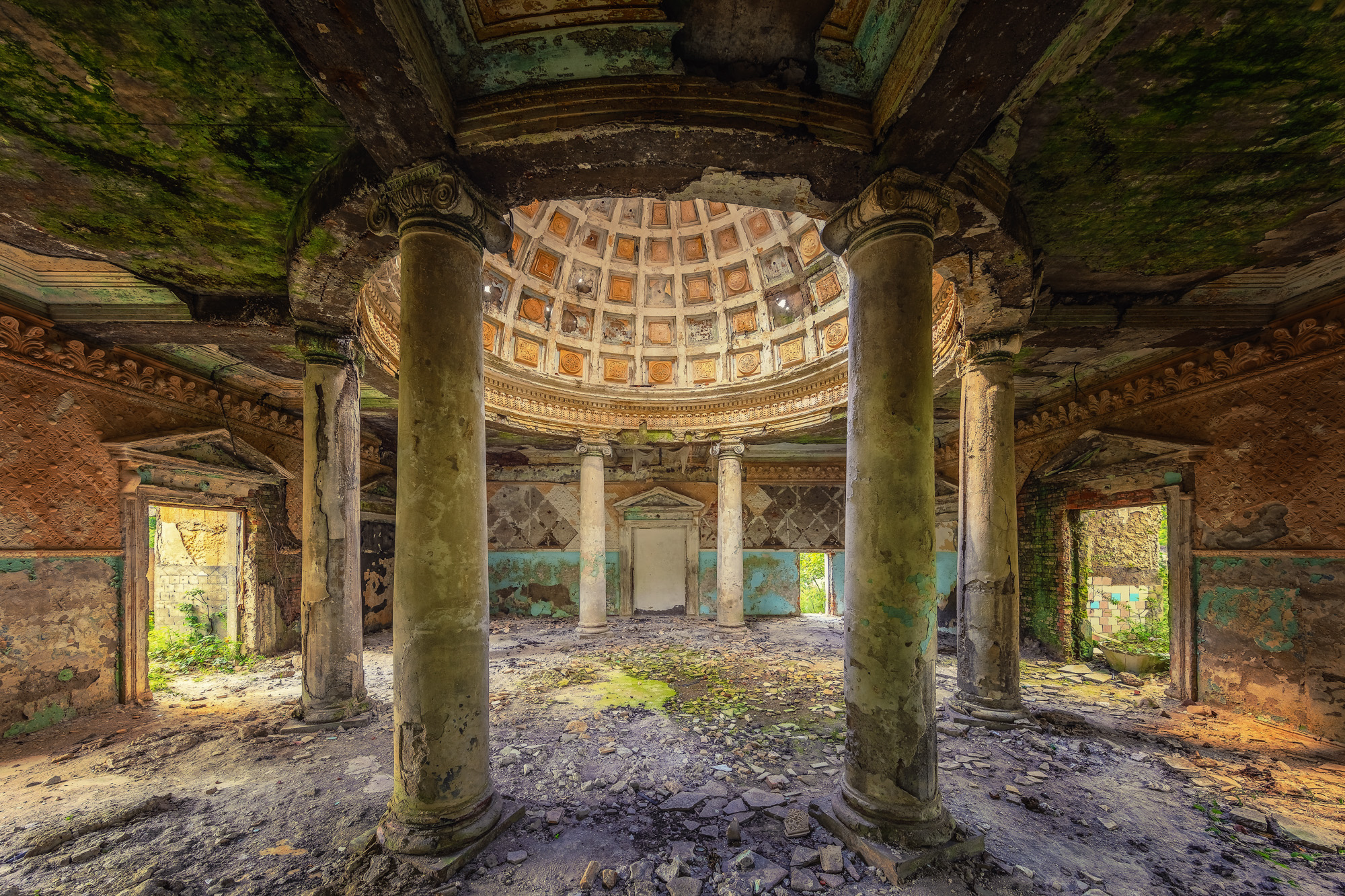 Peeling walls and shadows dominate the deserted estate, leaving only the faint impression of past beauty.