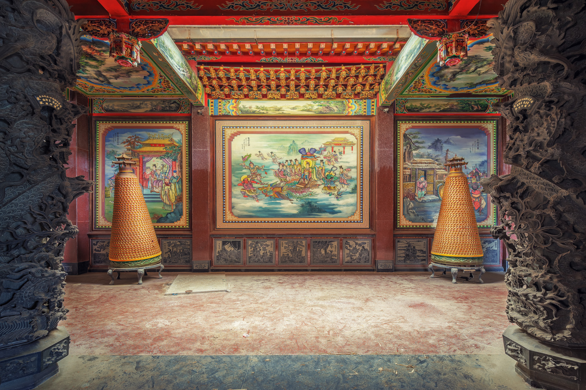 ..this abandoned temple in Taiwan showcases intricate wood carvings, now faded and worn, yet still revealing the grandeur of its past. The ornate altar, adorned with numerous dragon motifs, stands as a testament to its former spiritual significance.