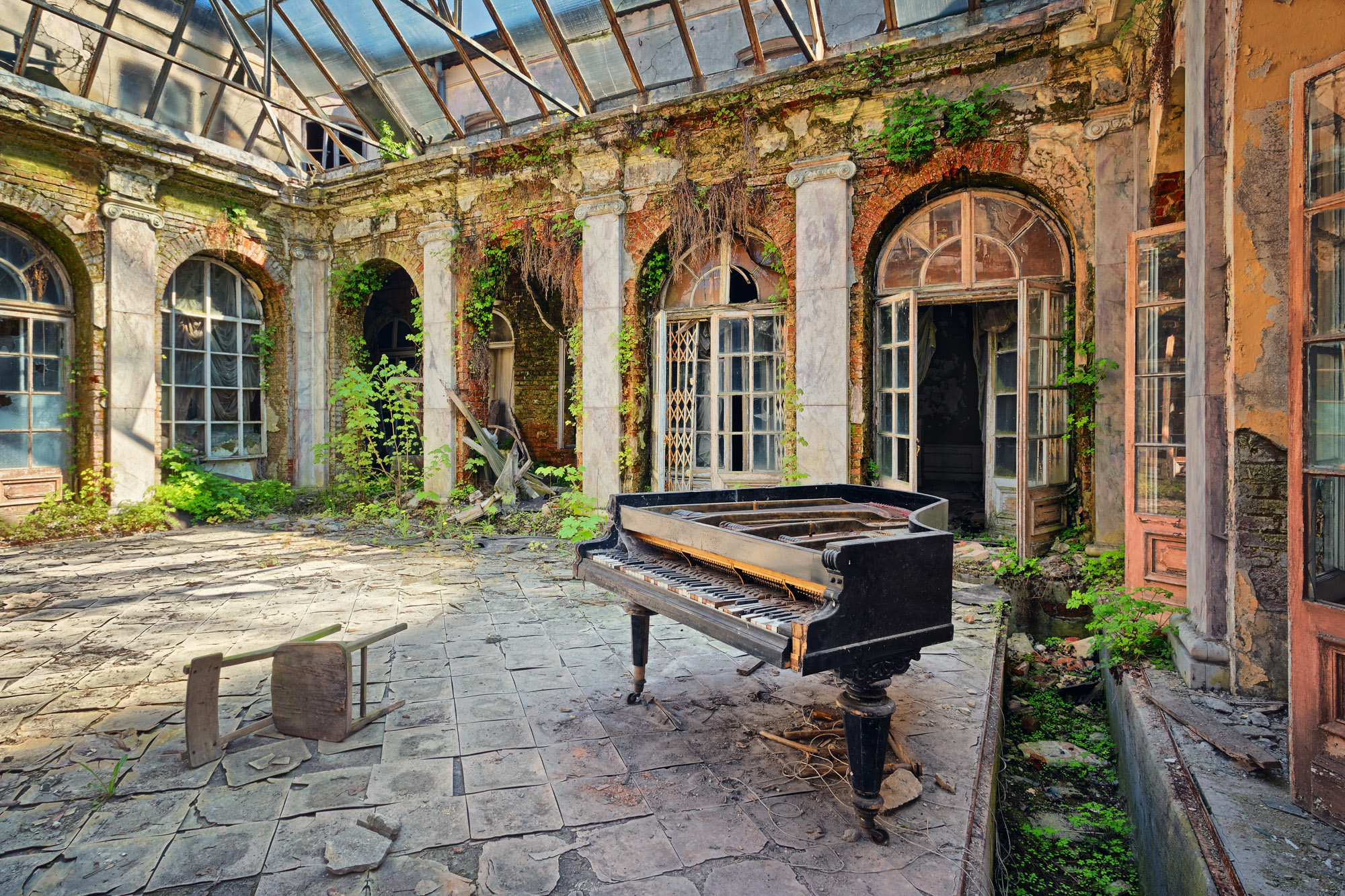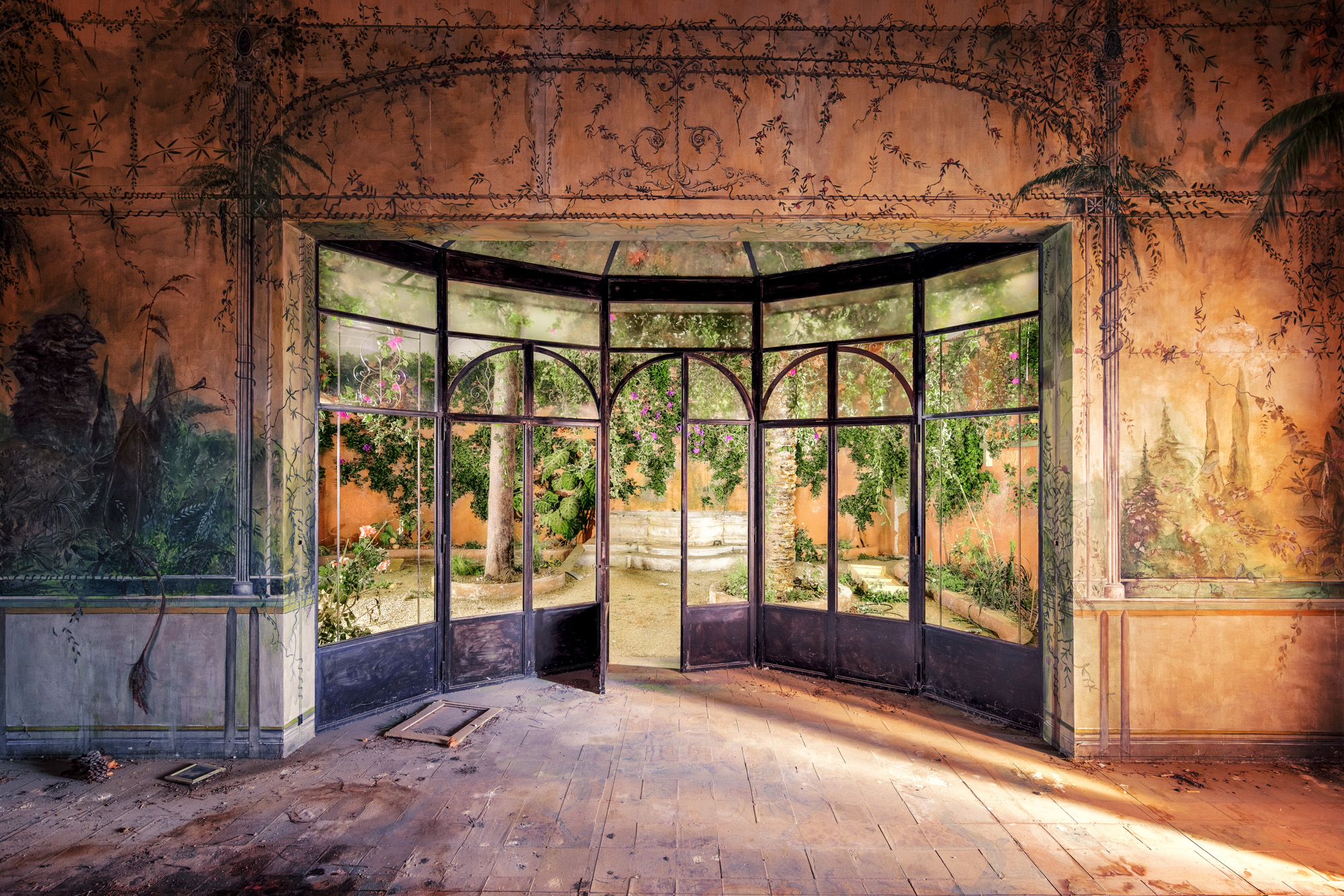 In this abandoned conservatory, the intricate glasswork still captures the imagination, a silent testament to a space once filled with life and light.