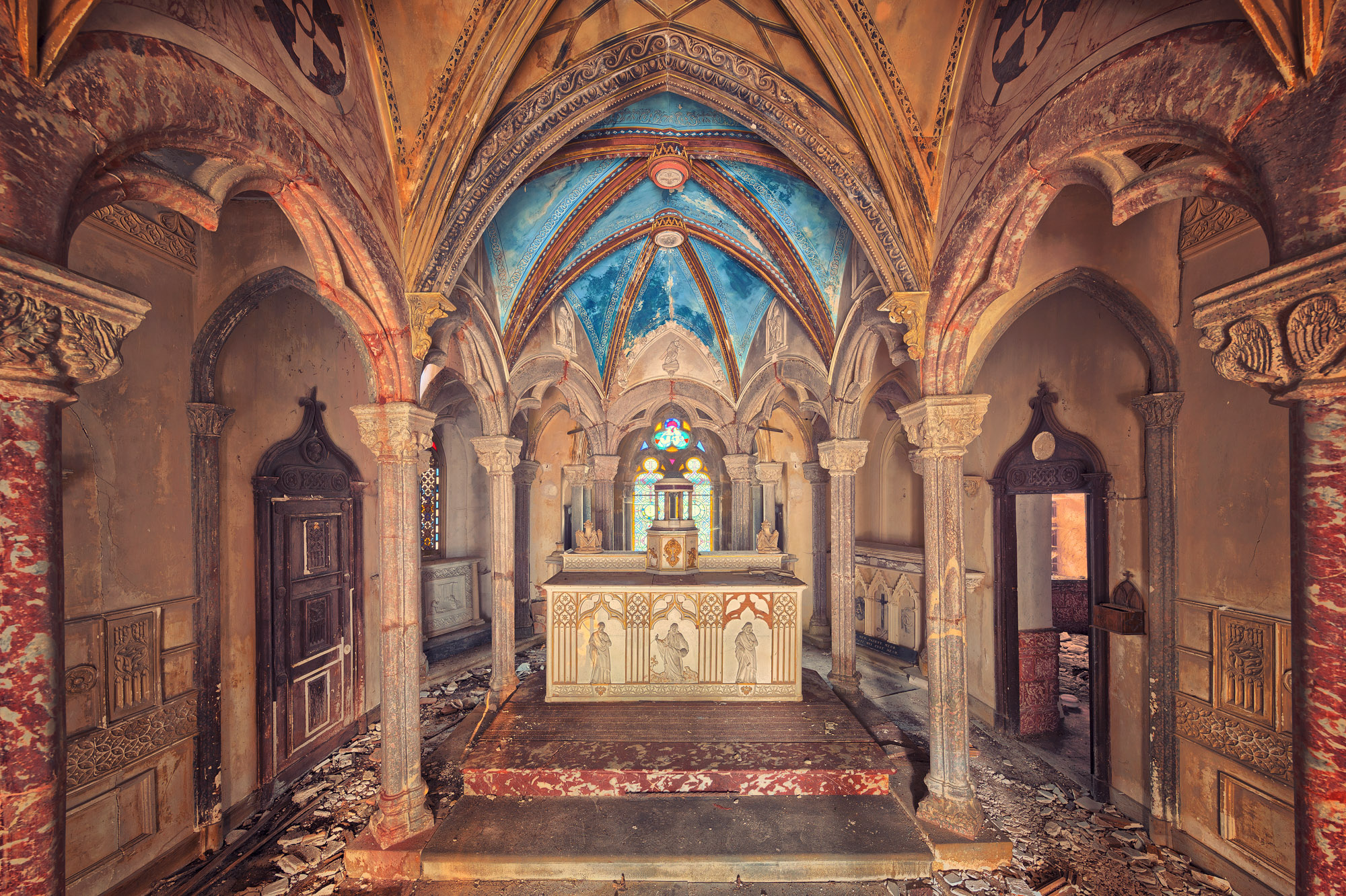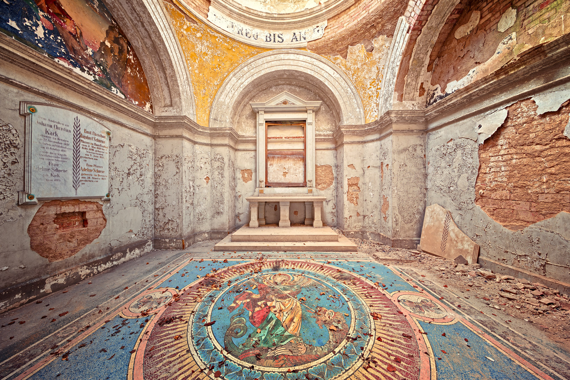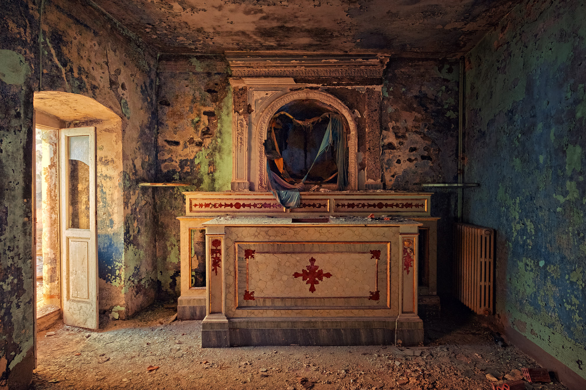 The altar of an abandoned church in Western Europe. The church grounds are now used for sheep grazing.
