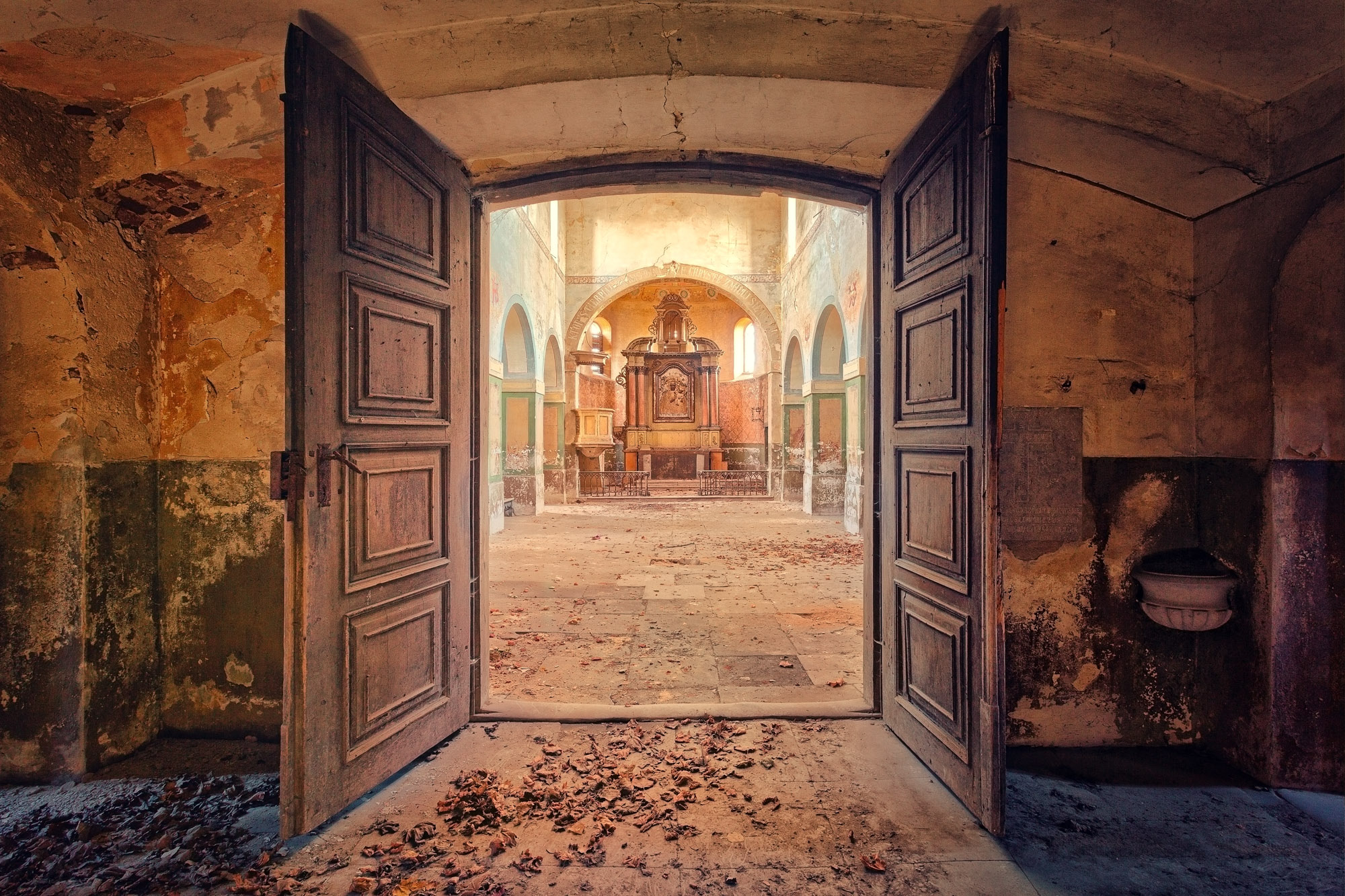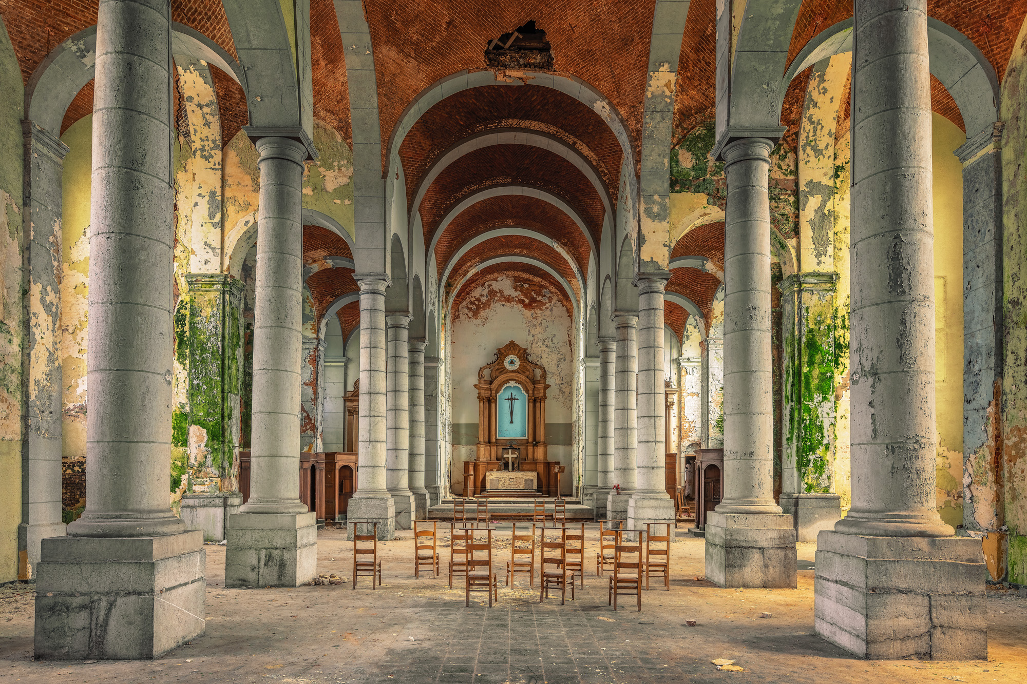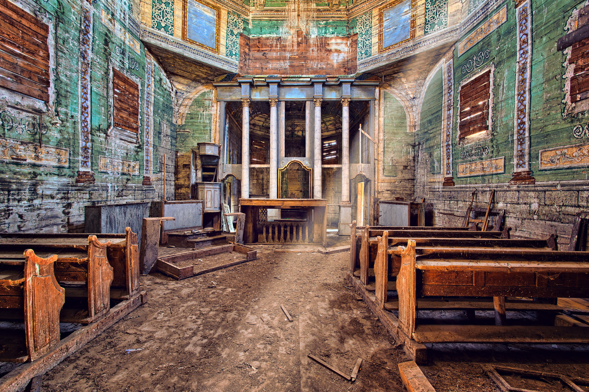 The altar of an abandoned church in Western Europe. The church grounds are now used for sheep grazing.